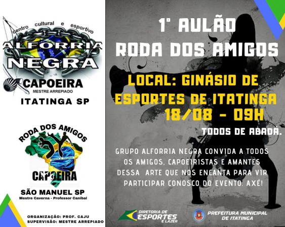 A Diretoria de Esportes e Lazer vem convidar amigos, esportistas e amantes da capoeira para prestigiar o 1º Aulão - Roda dos Amigos, que será realizado no Ginásio de Esportes de Itatinga no dia 18/08, com início previsto às 09h.