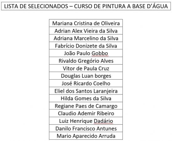 Lista com os nomes dos selecionados para o curso de Pintura a Base D'água que se iniciará na próxima segunda-feira, no CRAS às 8 horas. Obs.: levar 1 kg de alimento não perecível.