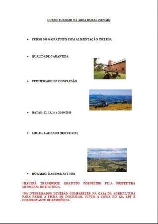 O curso será nos dias 12, 13, 14 e 20 de Setembro na cidade de Itatinga com aulas práticas no Hotel Fazenda Sonho Meu. Haverá transporte até o local do curso com café da manhã e almoço. E poderão se inscrever homens e mulheres maiores de 18 anos, na CASA DA AGRICULTURA munidos dos documentos necessários.