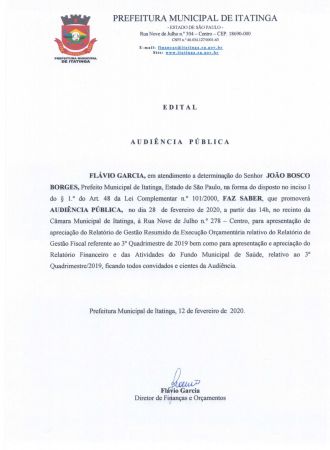 Local: Câmara Municipal de Itatinga (Rua Nove de Julho, nº 278)