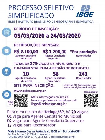 Informamos que estão abertas as inscrições para os Processos Seletivos para contratação de pessoal temporário para atuação no Censo 2020, havendo vagas em todos os municípios.