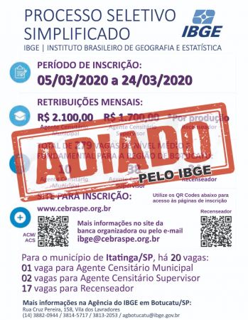Como medida emergencial de prevenção de contágio pelo COVID-19 (Novo Coronavírus) as inscrições do processo seletivo do IBGE foram adiadas. Logo divulgaremos nova data para realização!