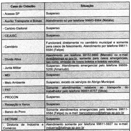 Informamos que devido as medidas temporárias e emergenciais de prevenção de contágio pelo COVID-19 (Novo Coronavírus), de acordo com o Decreto nº 2.772 de 19 de março de 2020, a Casa do Cidadão não estará aberta para a visitação pública e o atendimento presencial do público externo, mas estamos disponibilizando os telefones para contato com os setores, segue tabela que está em anexo no Decreto com descrição do funcionamento de cada setor da Casa do Cidadão.